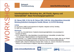 - Wie werden Agency und Vulnerabilität in sozialen Beziehungen zwischen geflüchteten Menschen, Sozialarbeiter*innen, Volunteers und Instanzen wie der Ausländerbehörde, Bildungsinstitutionen oder in Unterkünften für geflüchtete Menschen hergestellt?