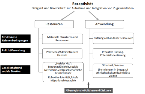 Für die Betrachtung der Aufnahmefähigkeit von Städten und Gemeinden bietet sich der Begriff der lokalen Rezeptivität an. Denn während der im Alltagsdiskurs überwiegend verwendete Integrationsbegriff vor allem die Anpassungsleistung von Zugewanderten adressiert, lenkt Rezeptivität den Blick auf die lokalen Gegebenheiten, die die Grundlage für das Ankommen, Einleben und die Teilhabe von Zugewanderten darstellen. Lokale Rezeptivität kann definiert werden als die Fähigkeit von lokalen Gesellschaften, mit ihren verfügbaren Ressourcen die Aufnahme von Geflüchteten zu unterstützen (sh. Diagramm weiter unten). Auf der Ressourcenseite unterscheidet das Modell zwischen a) den materiellen Strukturen und Ressourcen, b) lokalen Politikansätzen sowie der daraus resultierenden administrativen Praxis im Umgang mit Geflüchteten, und c) der sozialen Struktur der lokalen Gesellschaft.